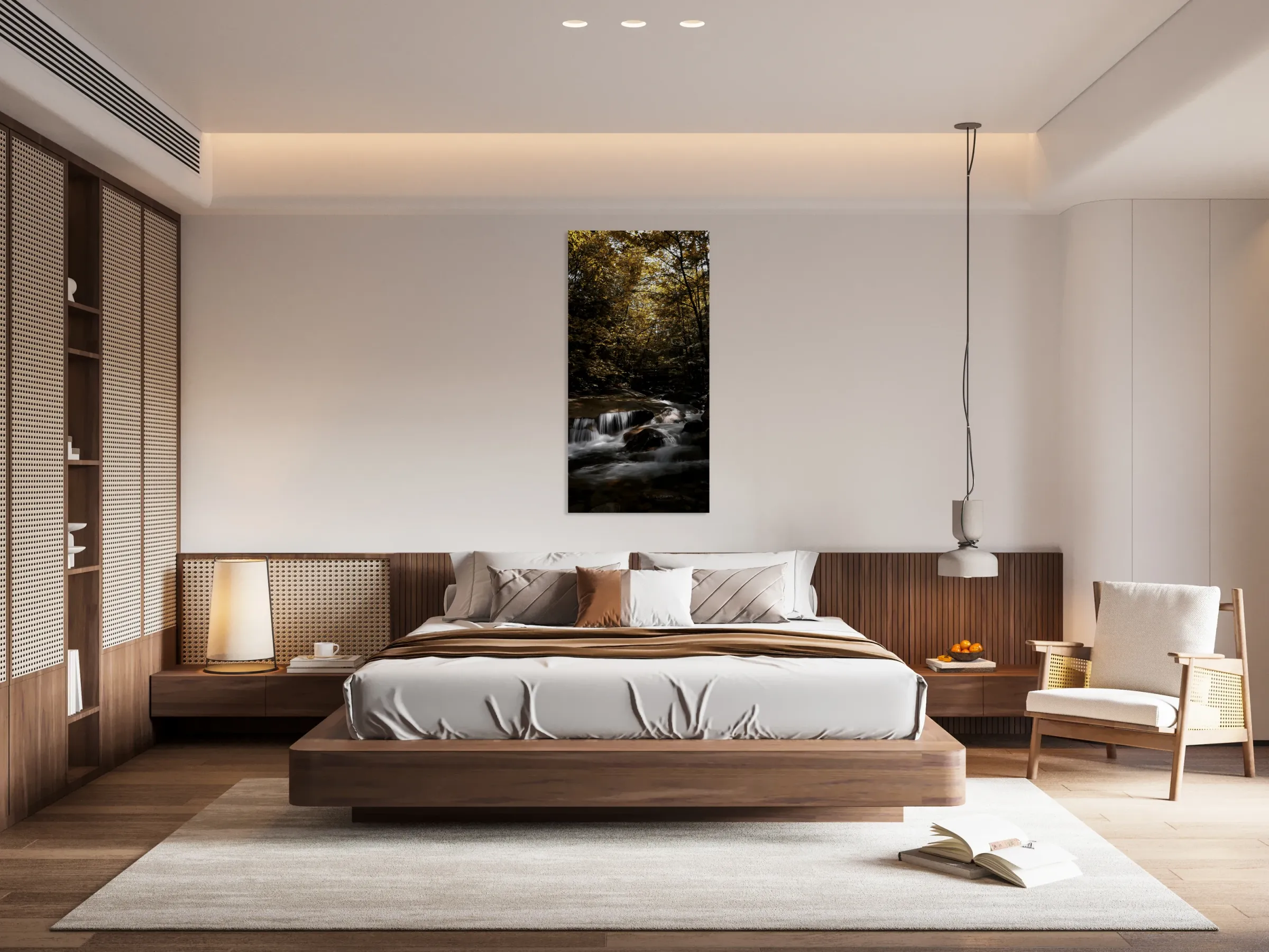An enchanting forest scene showcases a milky, soothing waterfall at the base, crowned by golden-leaved trees and subtle glimpses of the sky through th...[+]
