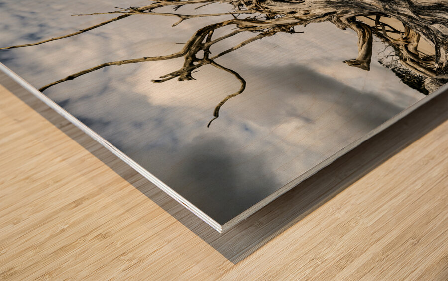 A towering driftwood tree with a massive trunk dominates the scene, set against a backdrop of brooding clouds and pristine, smooth, wet sand, conveyin...[+]