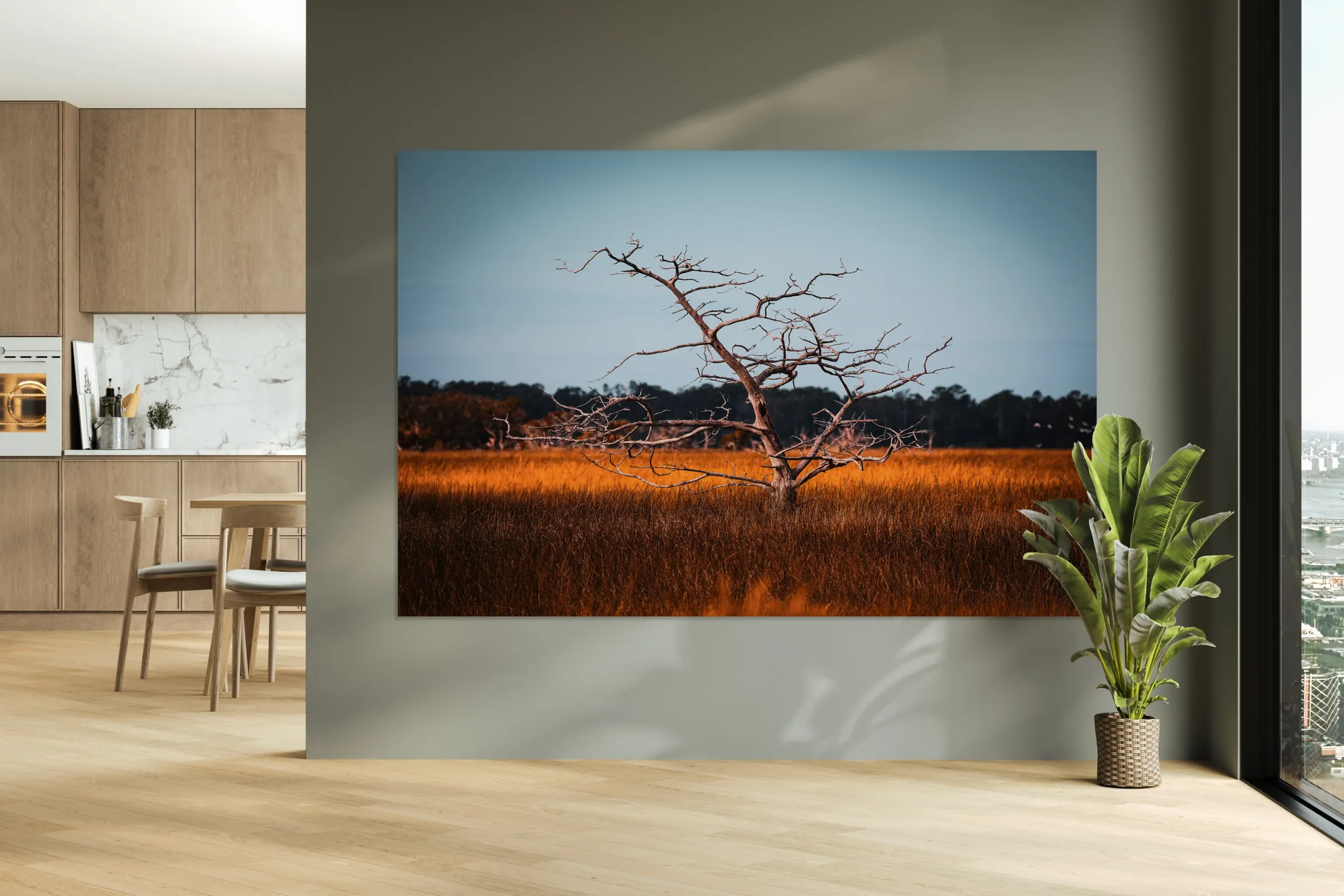 A leafless tree with twisted, aged branches stands as a resilient beacon amidst soft orange and brown grass under a serene blue sky.