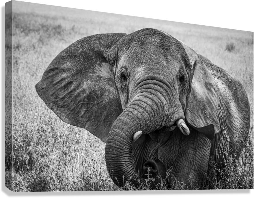 Majestic elephant gazes calmly, her wrinkled skin and chipped tusk set against dry grass in a soulful black-and-white portrait .