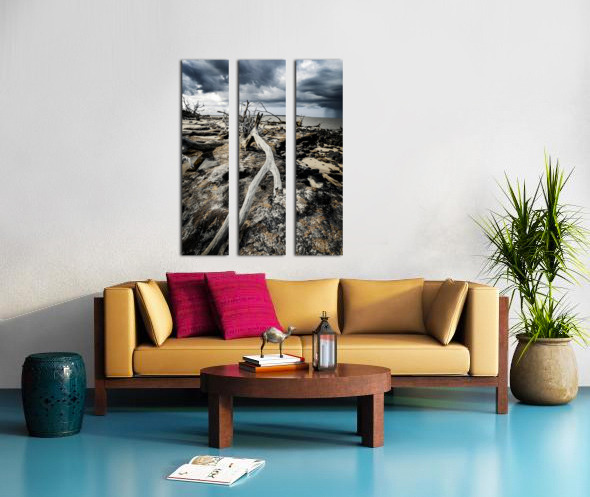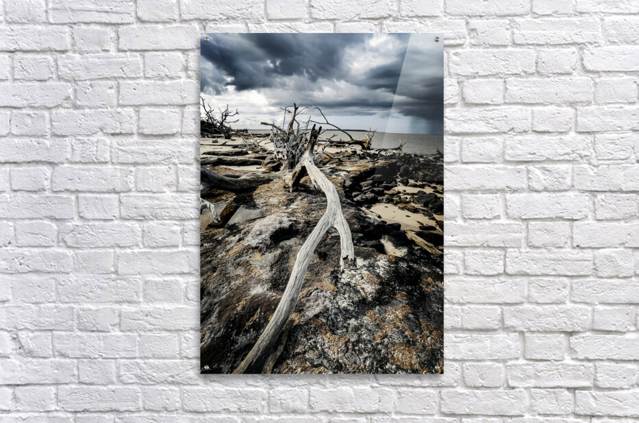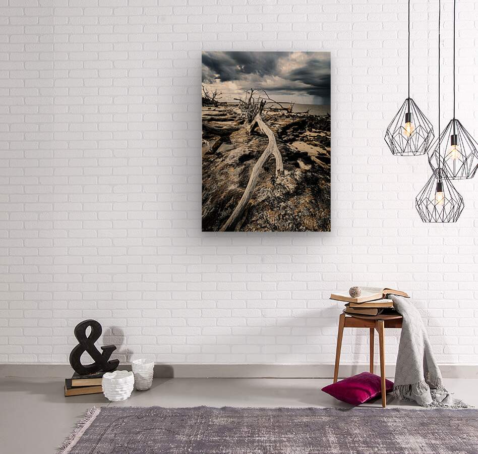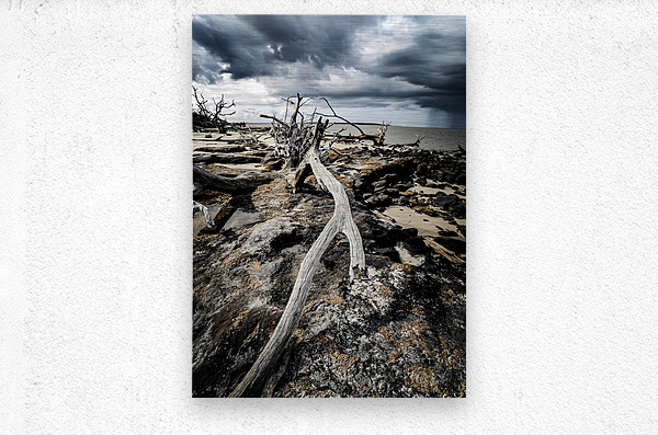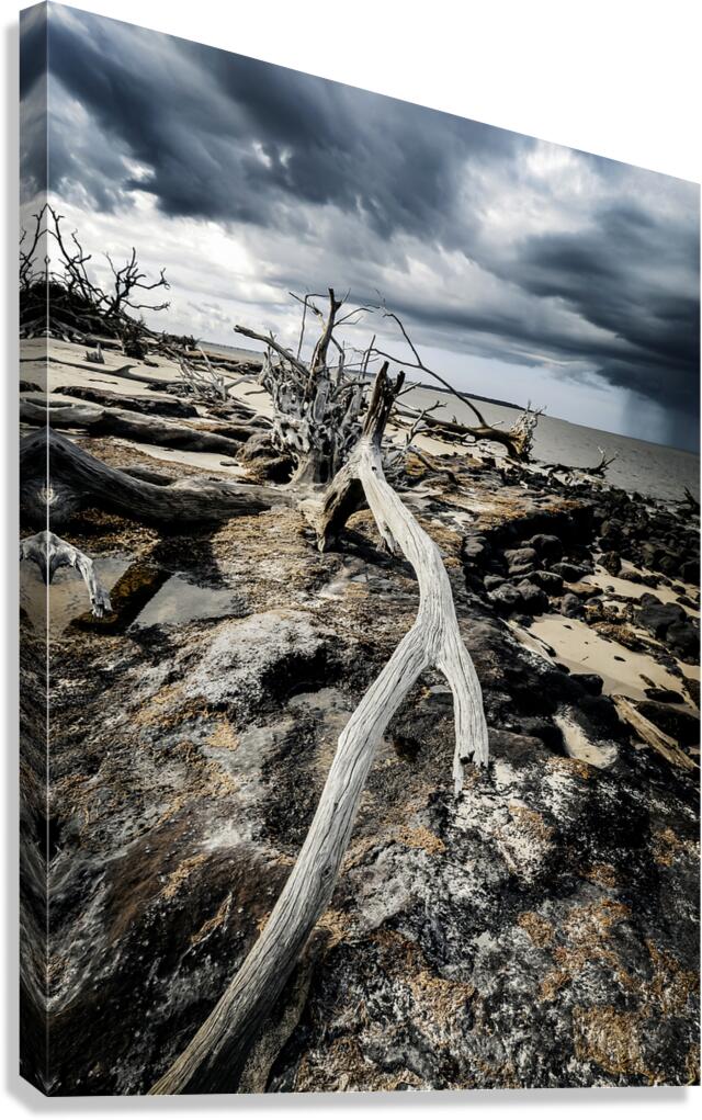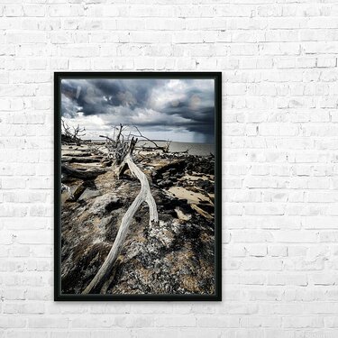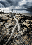 A dramatic tableau of a fallen driftwood tree centered with the trunk nearer, set against a stormy sky and rain clouds, textured sand and turf, puddle...[+]