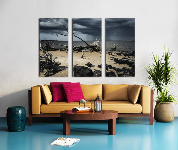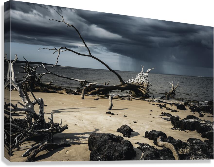 On a beach scattered with driftwood, the play of sunlight on the wood contrasts starkly against dark, rain-laden clouds with visible showers, capturing a moment of natural drama. Florida Coast