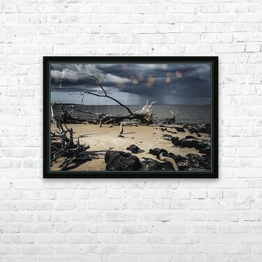 On a beach scattered with driftwood, the play of sunlight on the wood contrasts starkly against dark, rain-laden clouds with visible showers, capturin...[+]