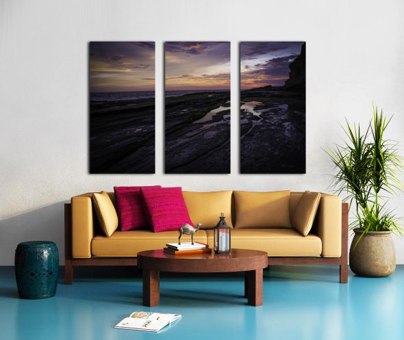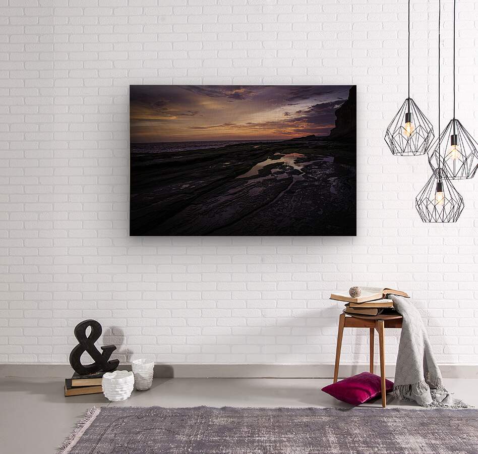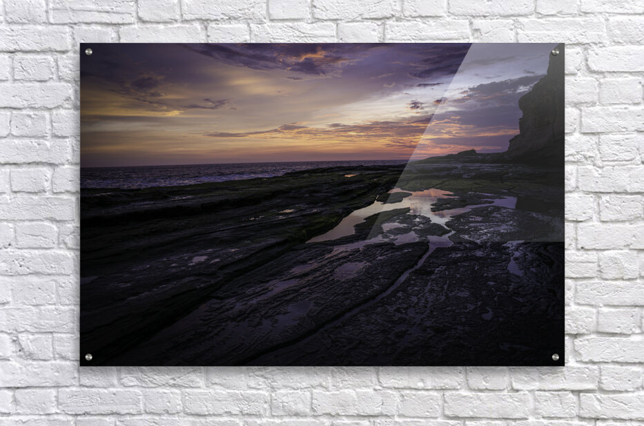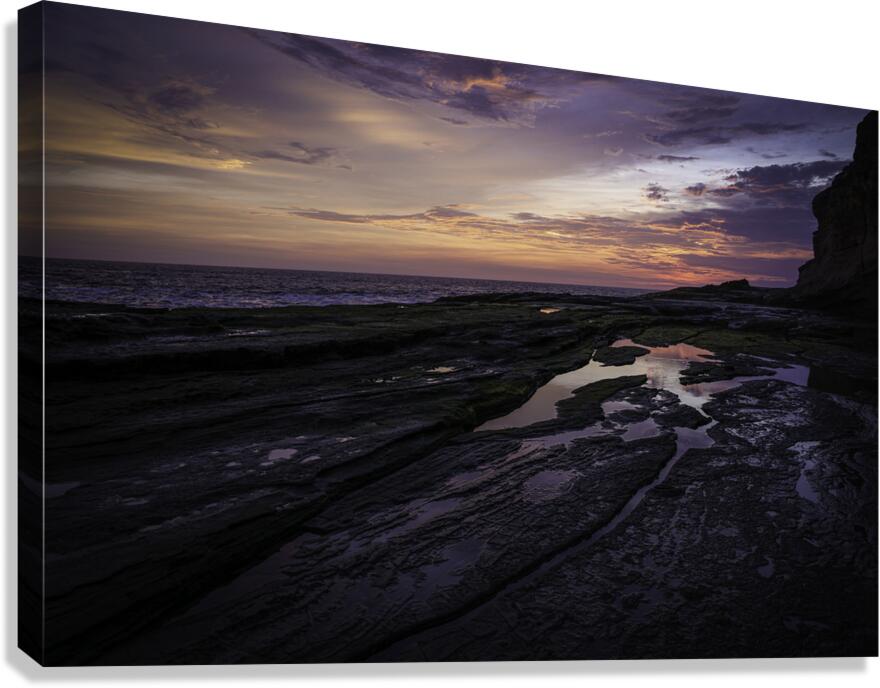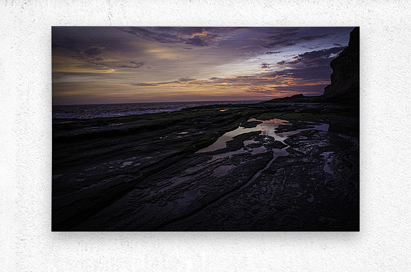 This gallery piece elegantly captures the serene aftermath of sunset, where clouds saturated with orange, violet, and pink hues are meticulously reflected in the calm, rock-layered shore pools, creating a breathtaking natural tapestry.