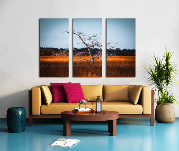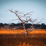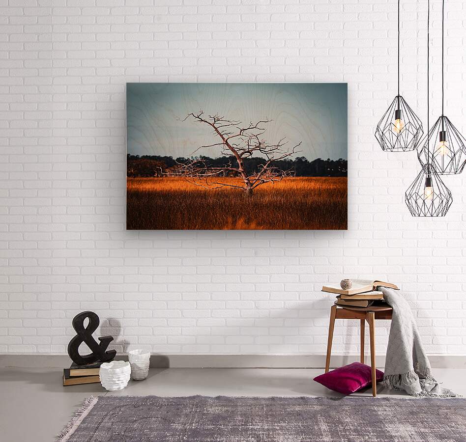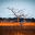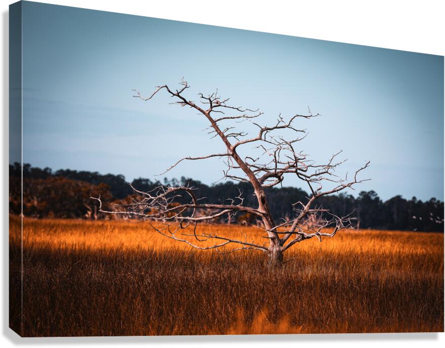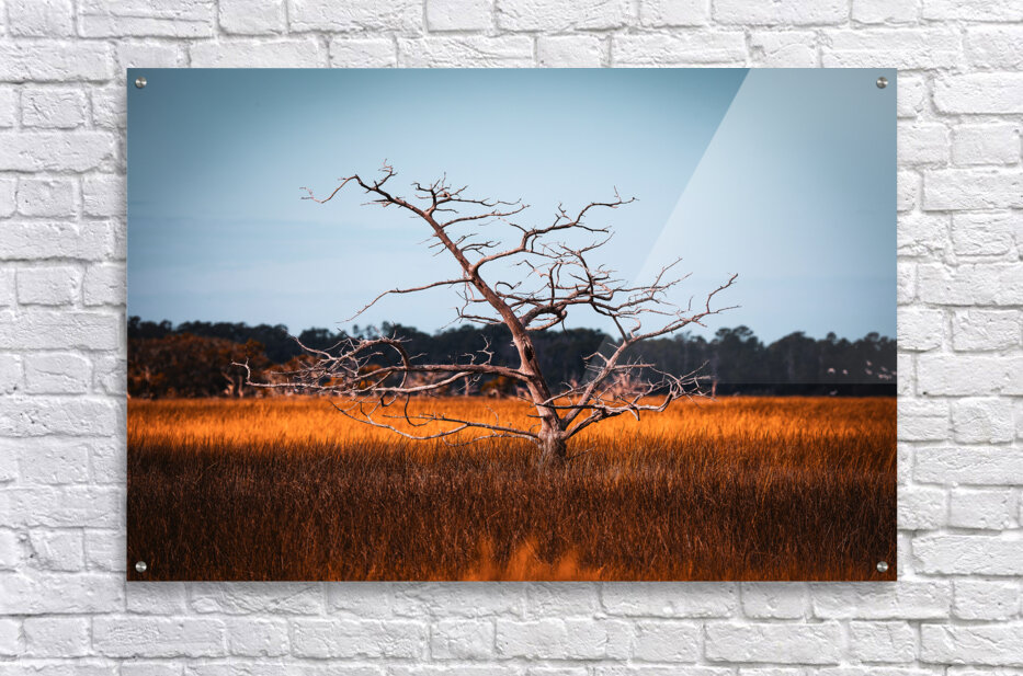 A leafless tree with twisted, aged branches stands as a resilient beacon amidst soft orange and brown grass under a serene blue sky.